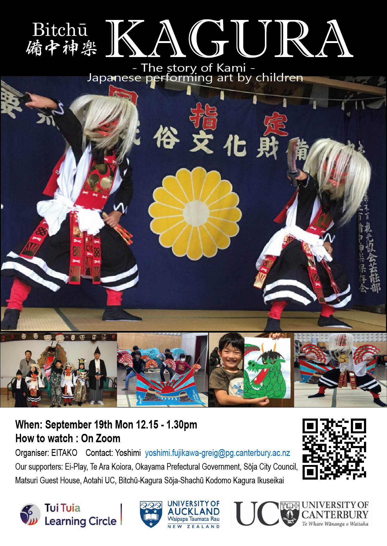 Today, the children of Bicchū will show us their traditional performance, and we can watch two episodes of Kagura. They are about two kami: Sarudahiko-no-Mikoto and Susanoo.