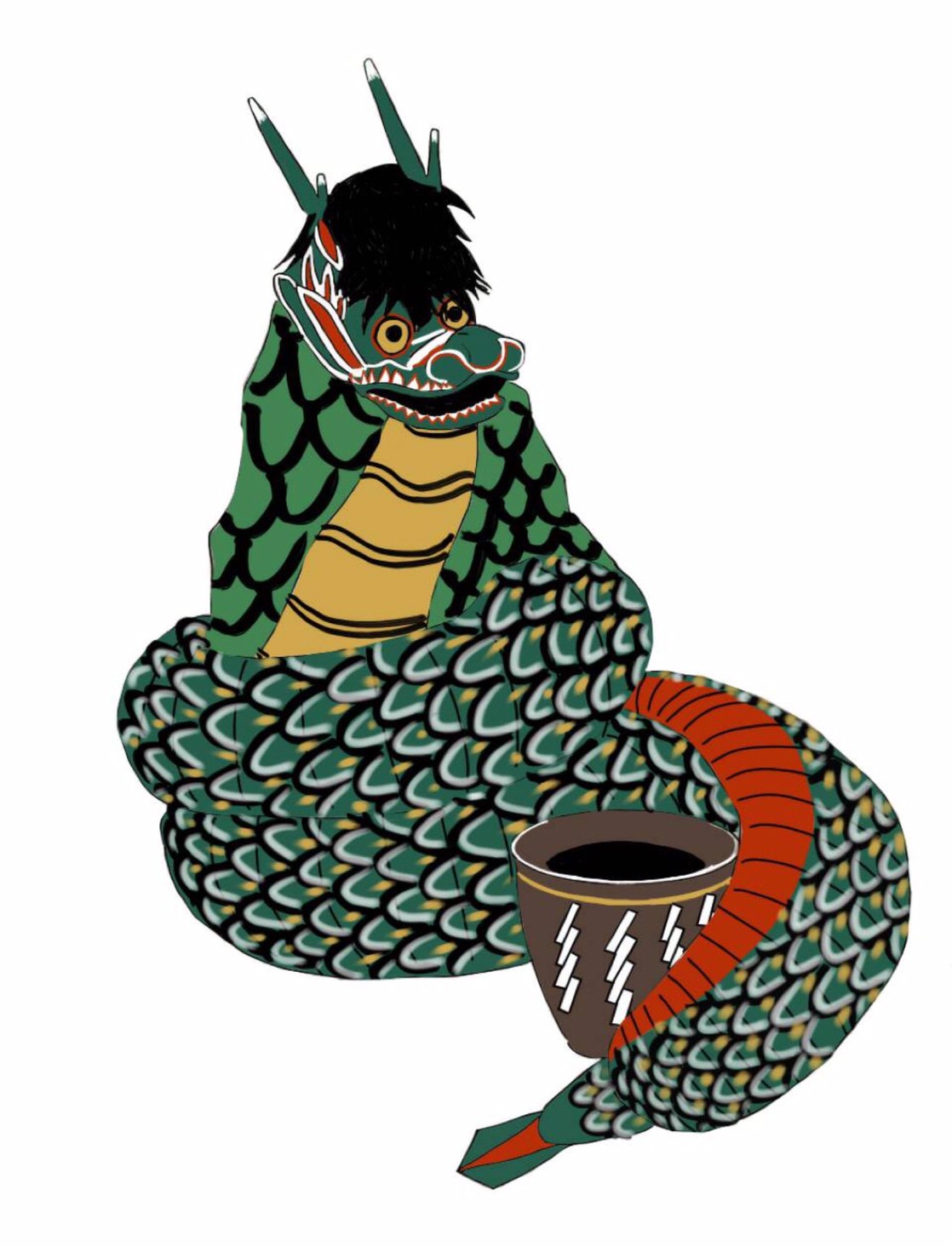 Susanoo met a couple on his way and they asked Susanoo to save their daughter Kushi-Inada Hime from a huge snake. The snake was called Yamata-no-Orochi and it had 8 heads, and it was so big.